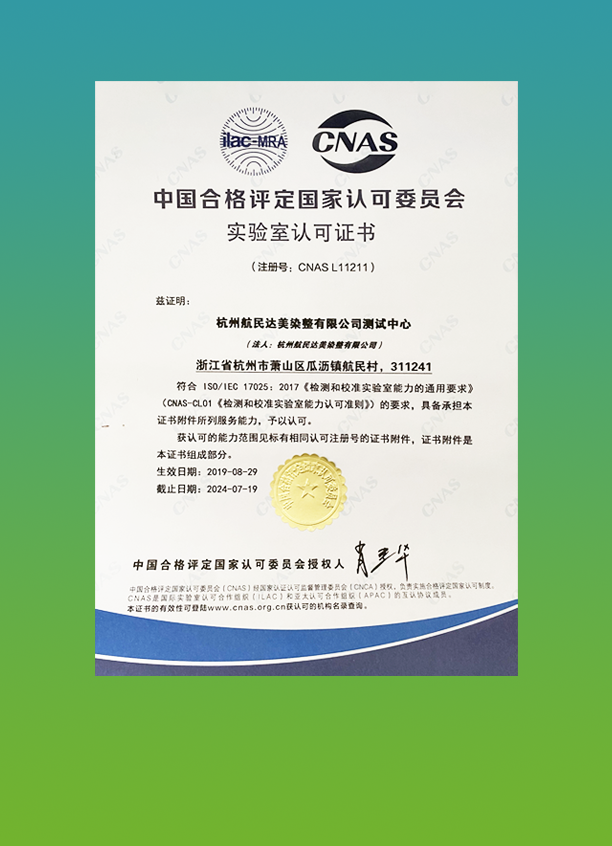 杭州航民達美染整有限公司測試中心是獲中國合格評定國家認可委員會(CNAS)認可的實驗室,認可的檢測能力范圍包括起毛起球、拉伸、撕破等9大類26項。